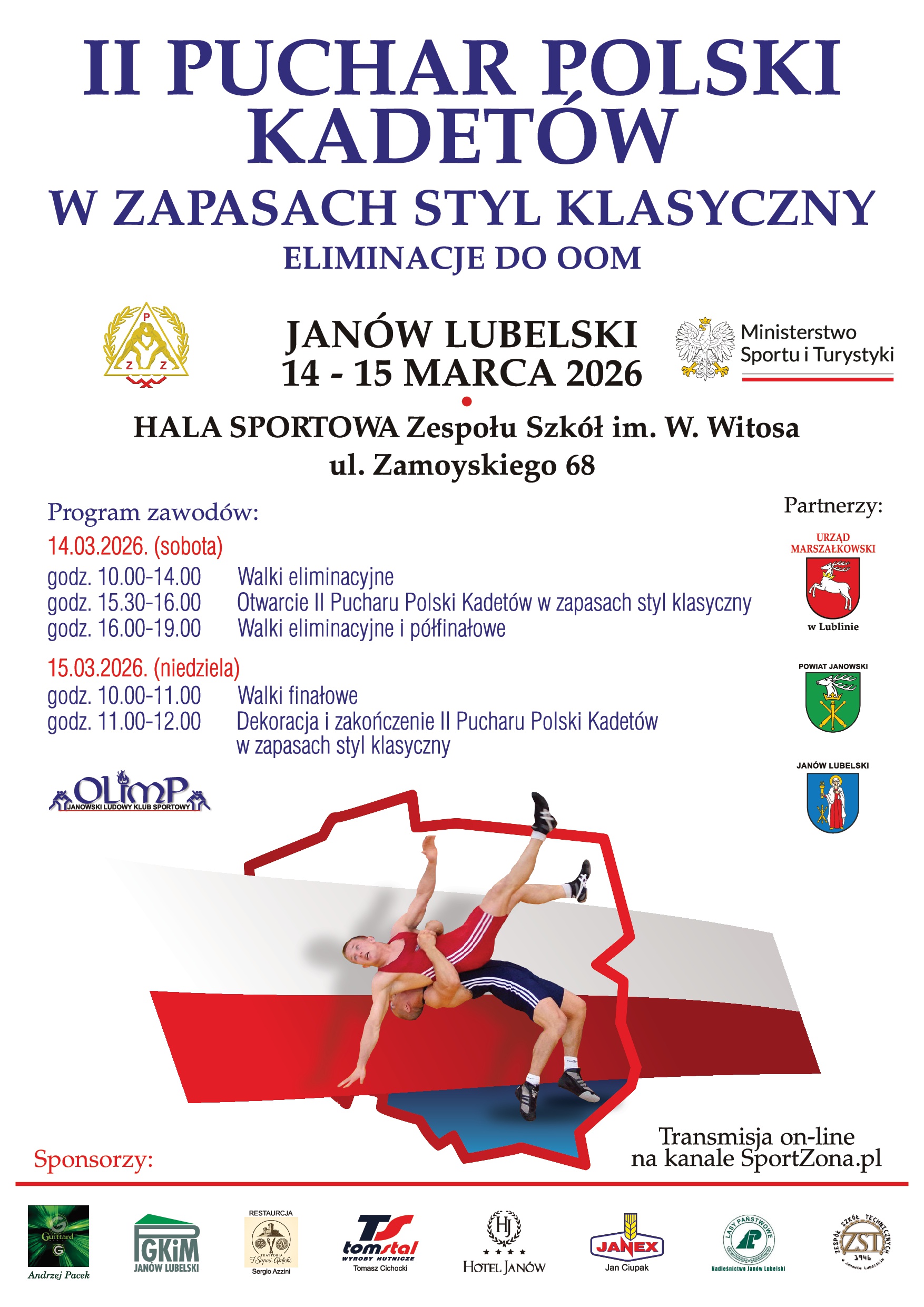 Kolejne dwa medale Mistrzostw Polski wywalczyli zapaśnicy janowskiego „Olimpu”. W Kostrzynie nad Odrą w dniach 20-21.02.2026r. odbyły się Mistrzostwa Polski U20 (18-20 lat) w zapasach styl klasyczny. Startowało 125 zawodników. Zawodnik „Olimpu” Szymon Góra w pięknym stylu wywalczył III miejsce – brązowy medal w kat. wagowej 67 kg. Nasz zawodnik w drodze po medal wygrał… Czytaj więcej