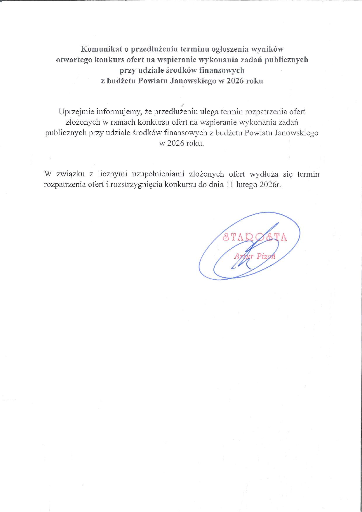Komunikat o przedłużeniu terminu ogłoszenia wyników otwartego konkursu ofert na wspieranie wykonania zadań publicznych przy udziale środków finansowych z budżetu Powiatu Janowskiego 2026 roku Opublikowano 30 stycznia 2026