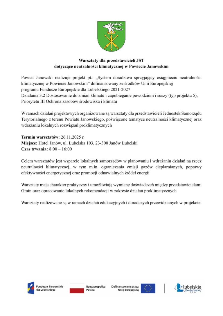 Doradca klimatyczny w ramach projektu pn..: „System doradztwa sprzyjający osiągnięciu neutralności klimatycznej w Powiecie Janowskim” współfinansowanego przez Unię Europejską w ramach