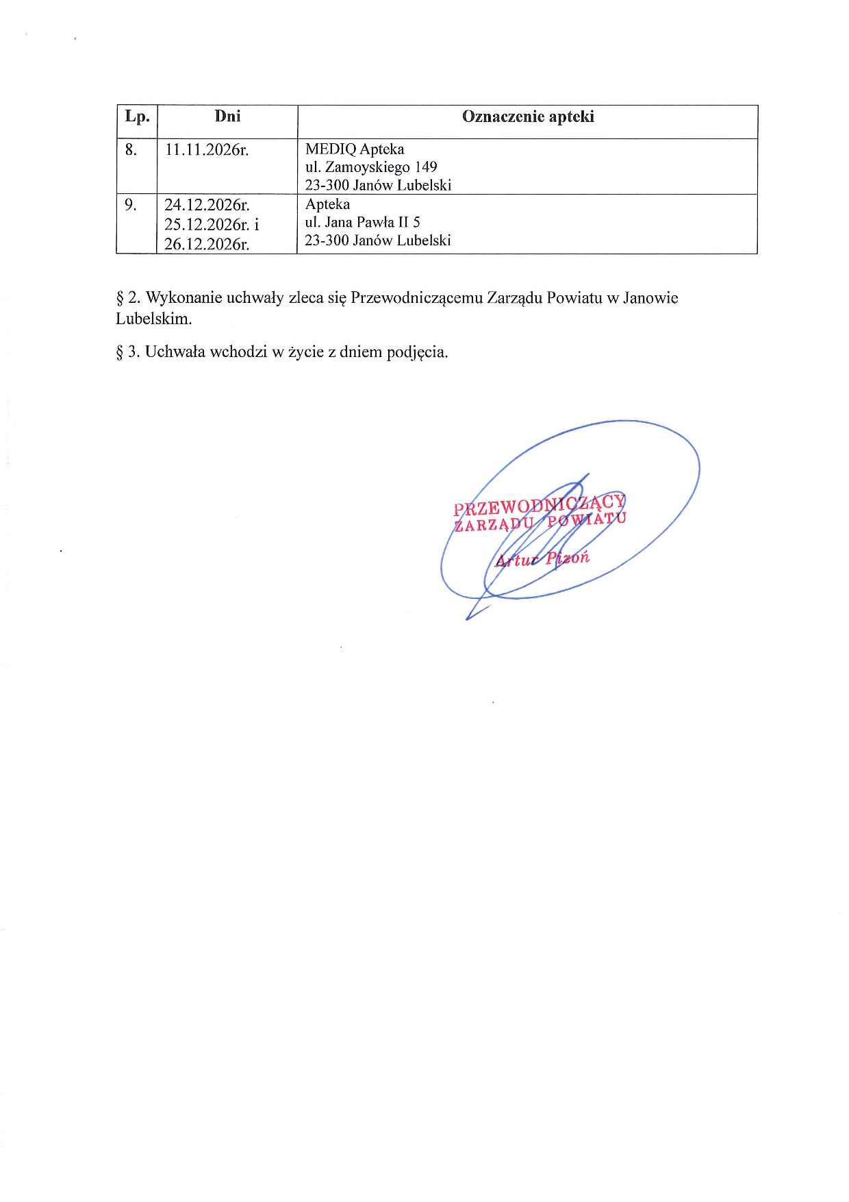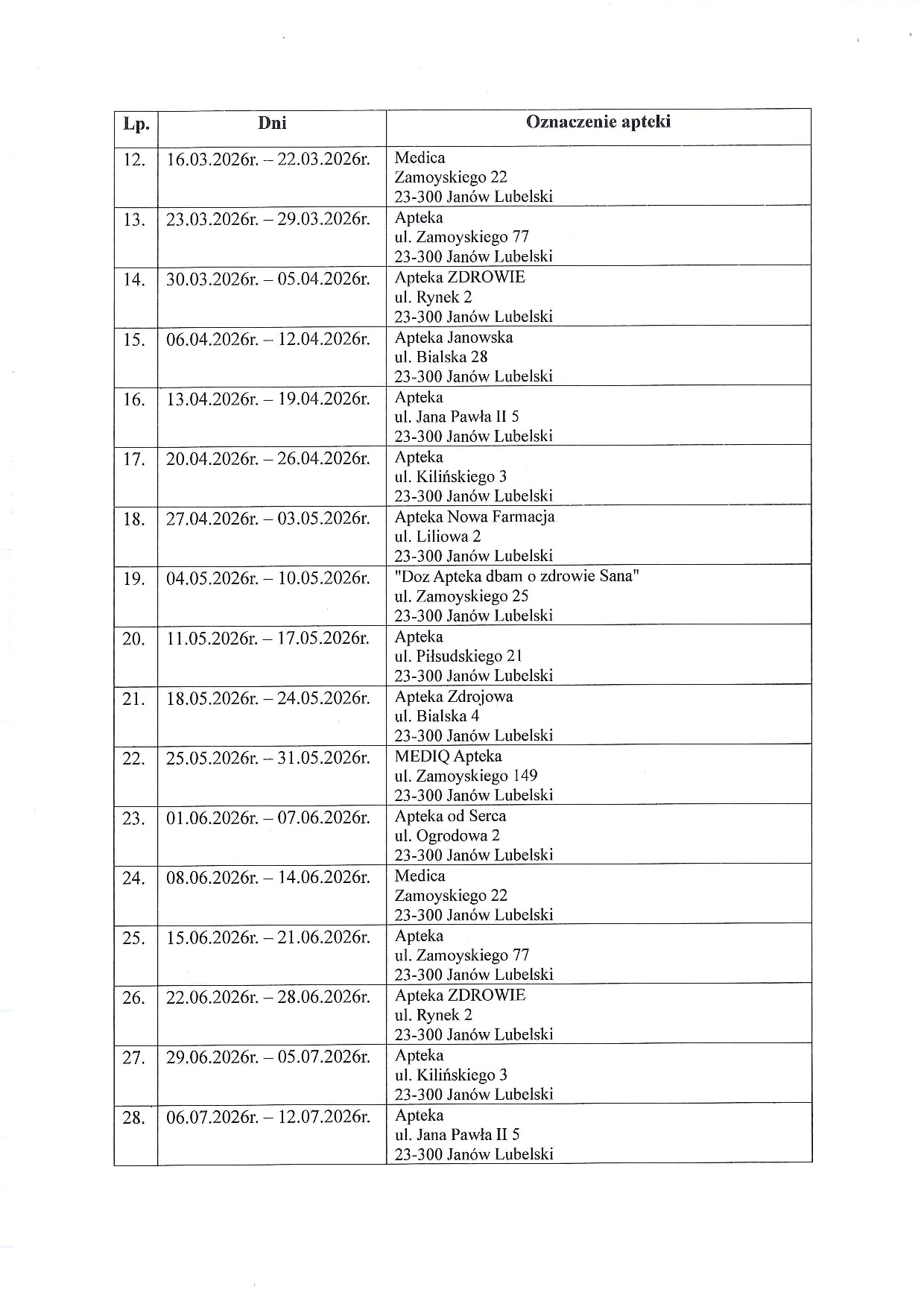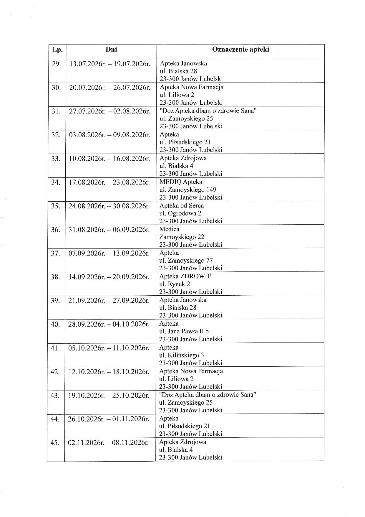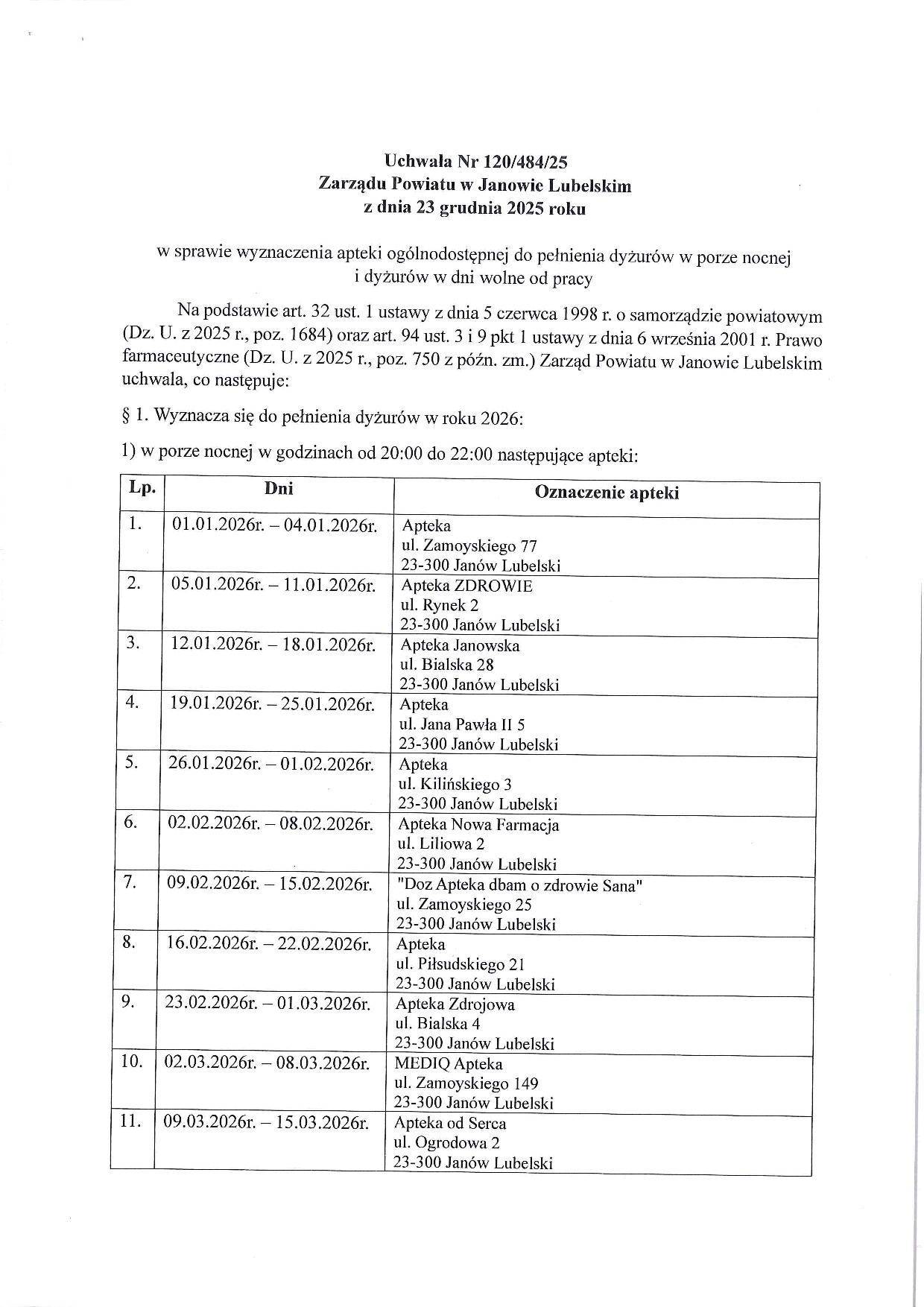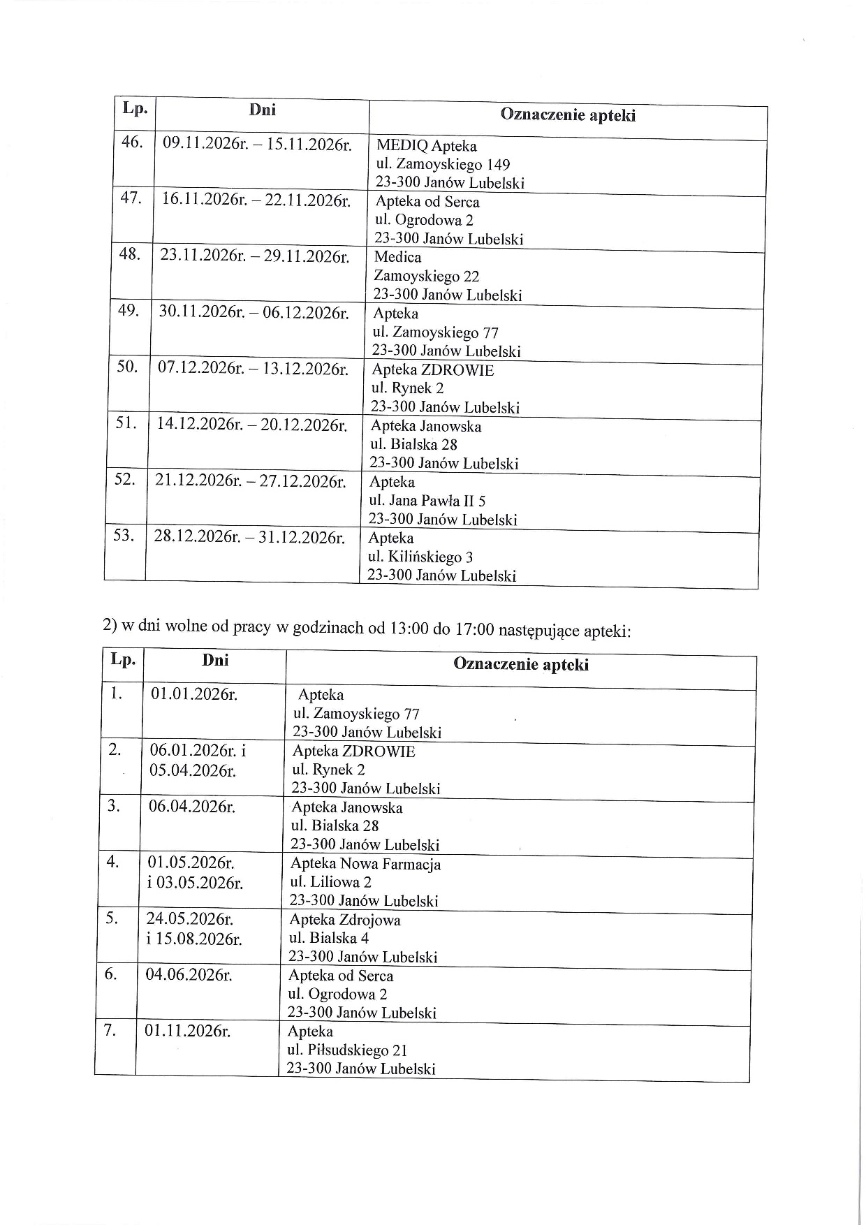 Rozkład godzin pracy aptek ogólnodostępnych położonych na terenie miasta Janowa Lubelskiego, obowiązujący od 1 stycznia 2026 roku.