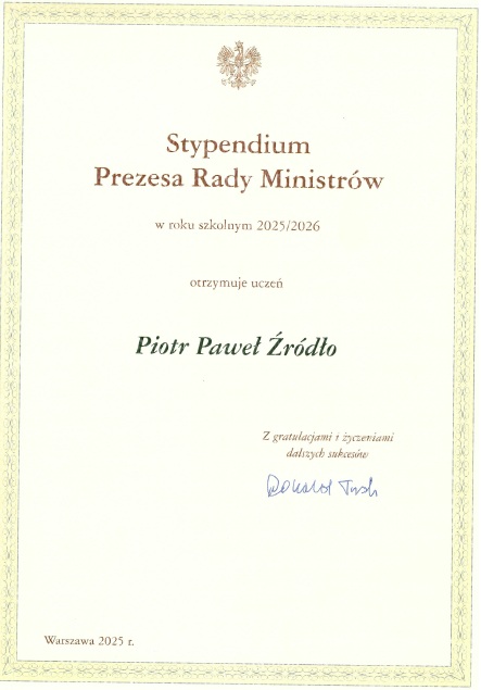 Piotr Źródło, uczeń klasy 2a w I LO im. Bohaterów Porytowego Wzgórza został wyróżniony prestiżowym stypendium Prezesa Rady Ministrów. To wyjątkowe osiągnięcie jest efektem jego systematycznej pracy, bardzo wysokiej średniej ocen wynoszącej 6.0 oraz imponującej aktywności pozalekcyjnej.