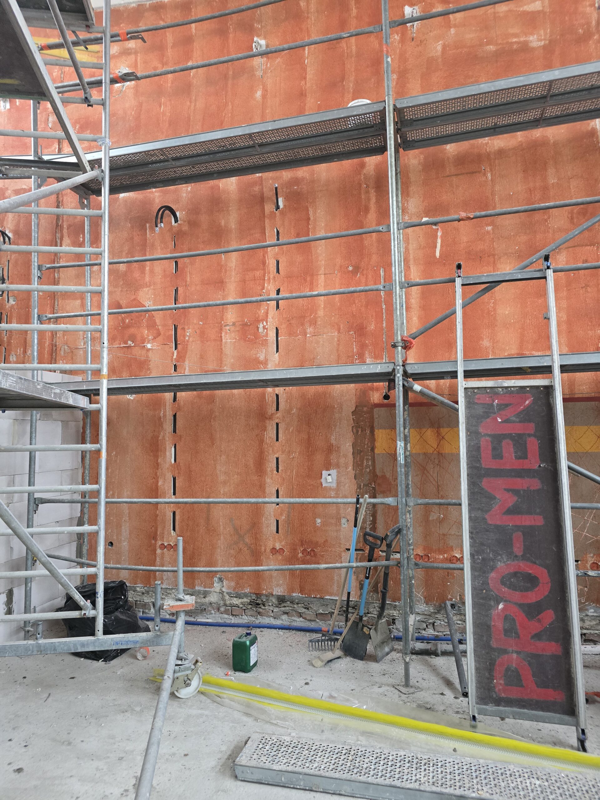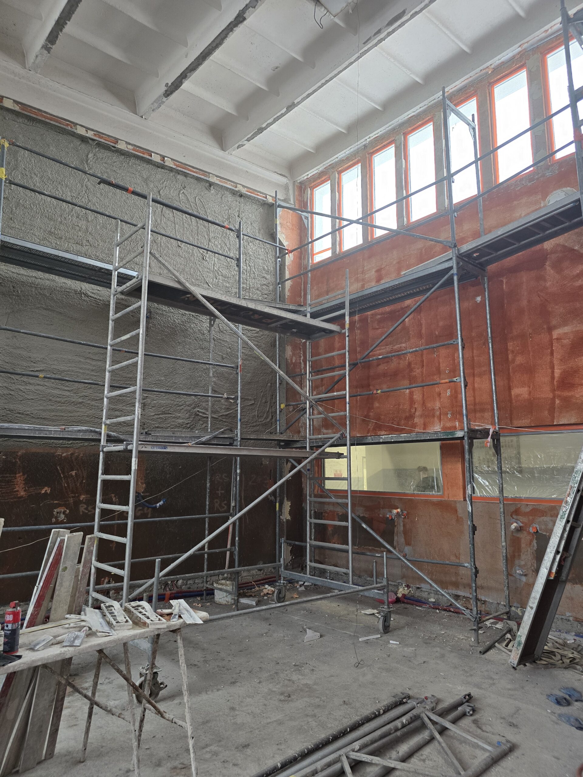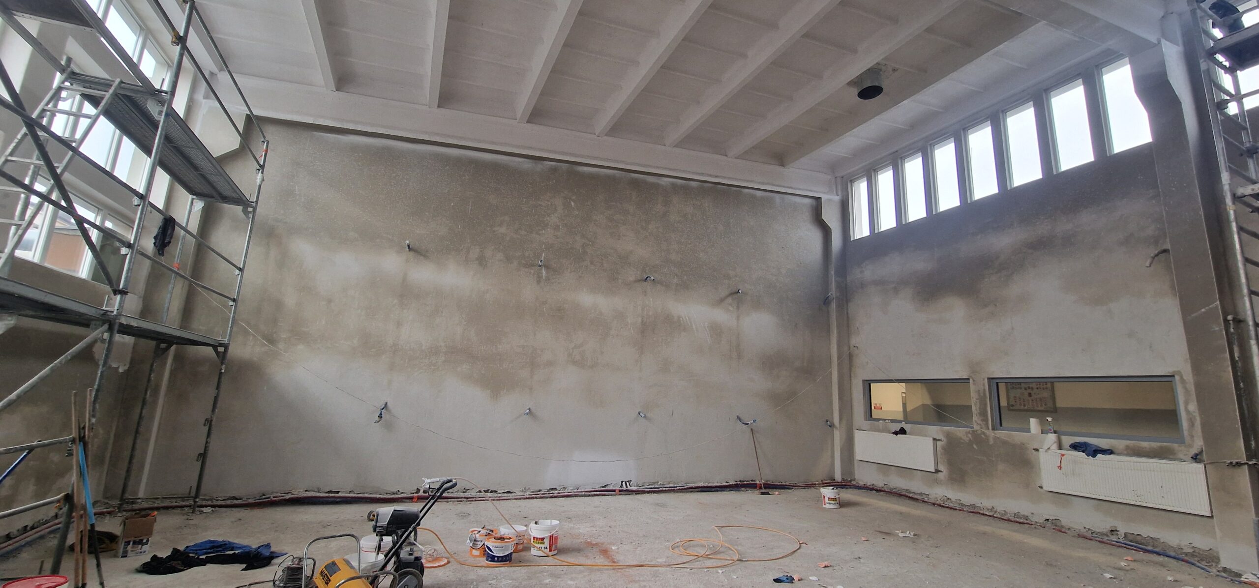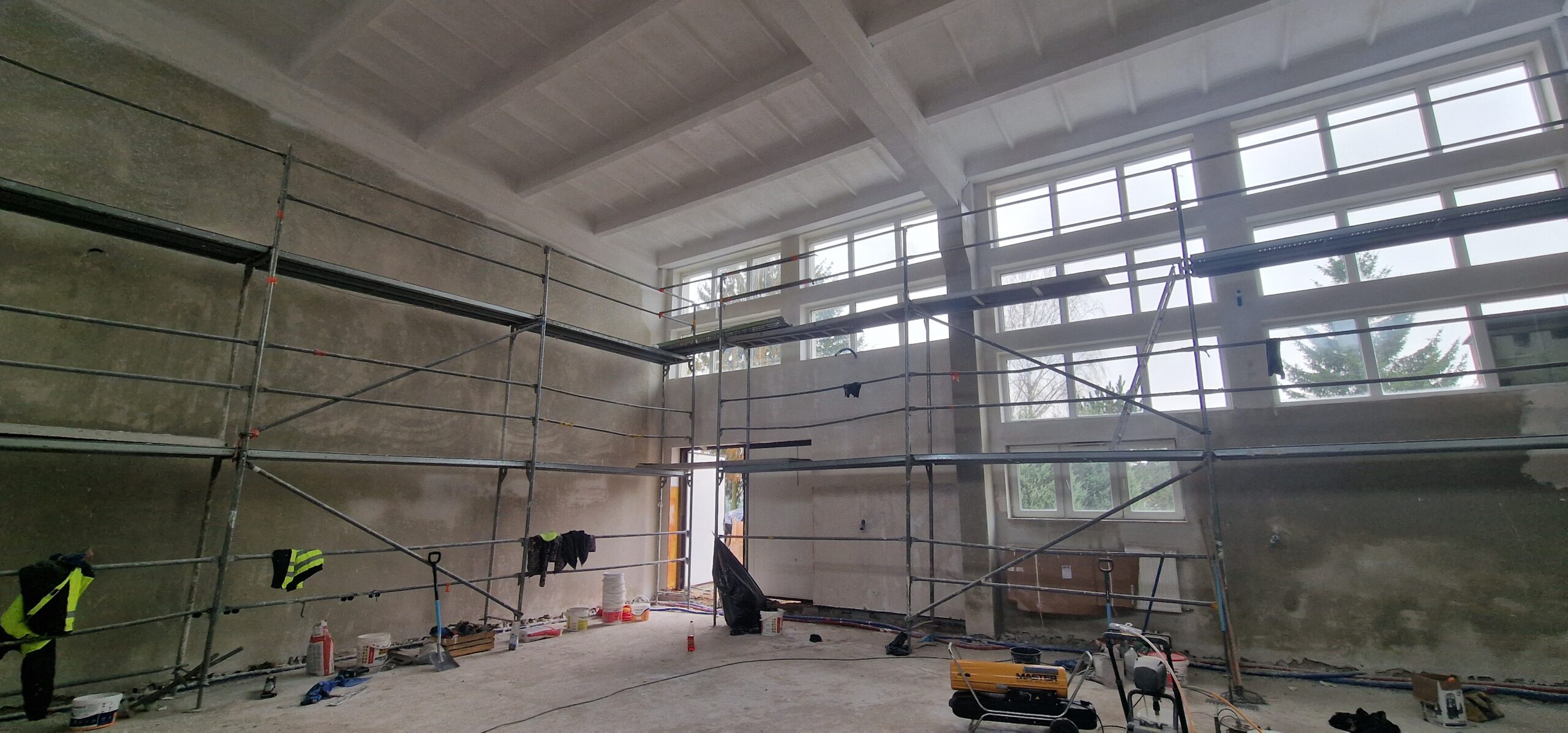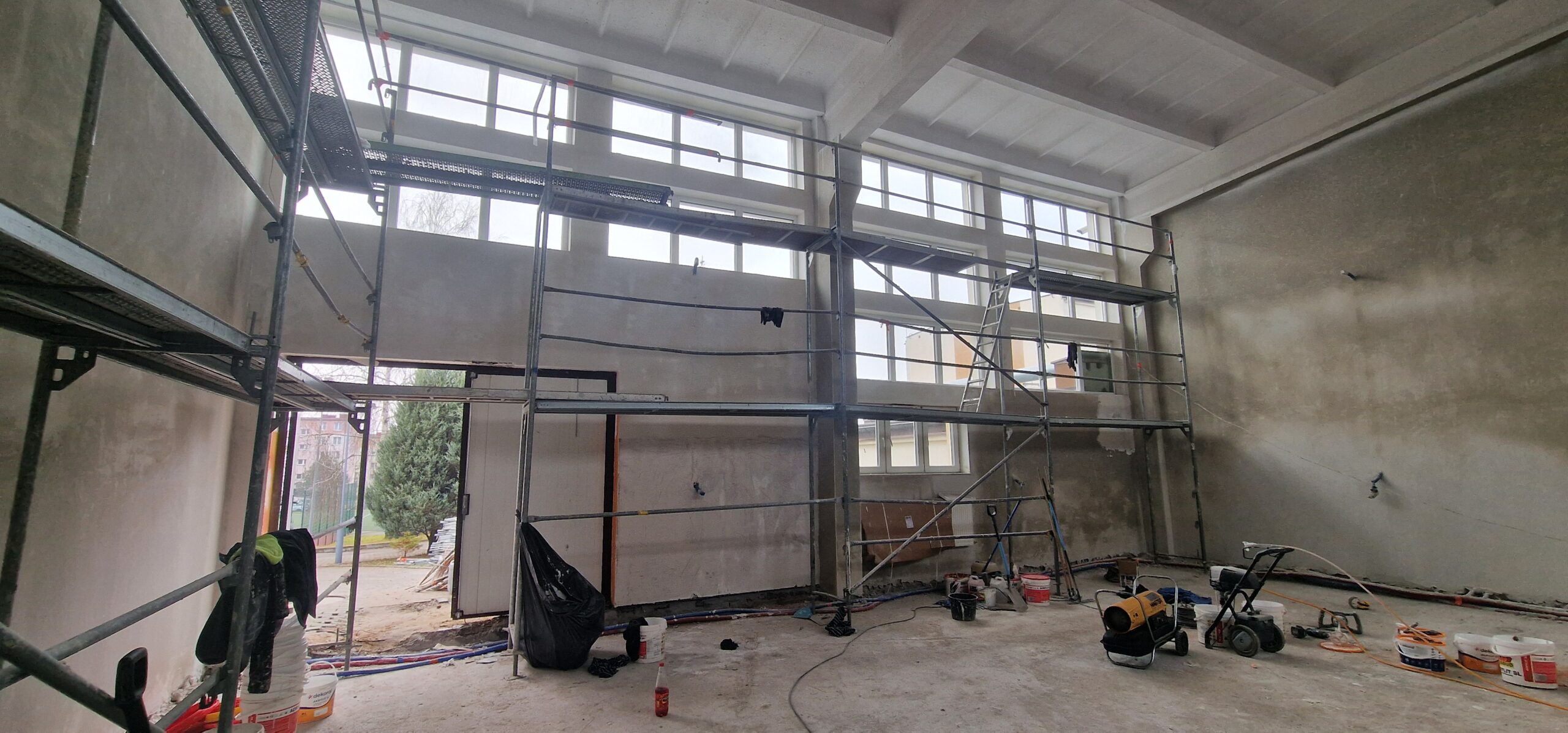 - Roboty budowlane. Remont pracowni polegać będzie na: wymianie posadzki na posadzkę przemysłową, wymianie drzwi zewnętrznych w istniejącym otworze, opuszczeniu istniejących drzwi i dostosowaniu do rzędnej posadzki w korytarzu, naprawie ubytków w tynku na ścianach oraz wykonaniu gładzi do pełnej wysokości ścian wraz z malaturą, wykonaniu ściany murowanej do wysokości 2,2 m z fartuchem z glazury po jednej ze stron oddzielającej część dydaktyczną z ławkami i biurkiem prowadzącego zajęcia od części przeznaczonej na obsługę techniczną. W ramach prac przewiduje się również przebudowę wewnętrznych instalacji elektrycznych, teletechnicznych i instalacji wodno-kanalizacyjnej. Zostanie wykonana również instalacja wentylacji mechanicznej z odzyskiem ciepła (w tym montaż centrali wentylacyjnej) oraz technologicznej.