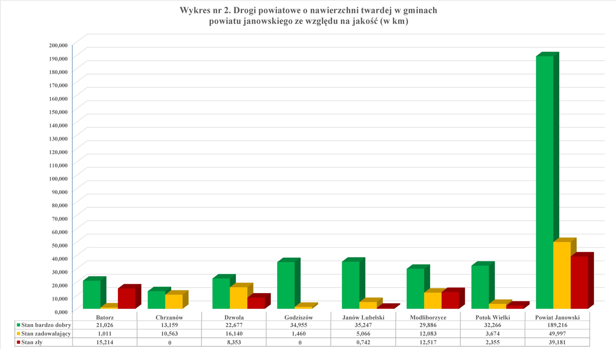 Wykres nr 2. Drogi powiatowe o nawierzchni twardej w gminach powiatu janowskiego ze względu na jakość (stan bardzo dobry, zadawalający, zły).