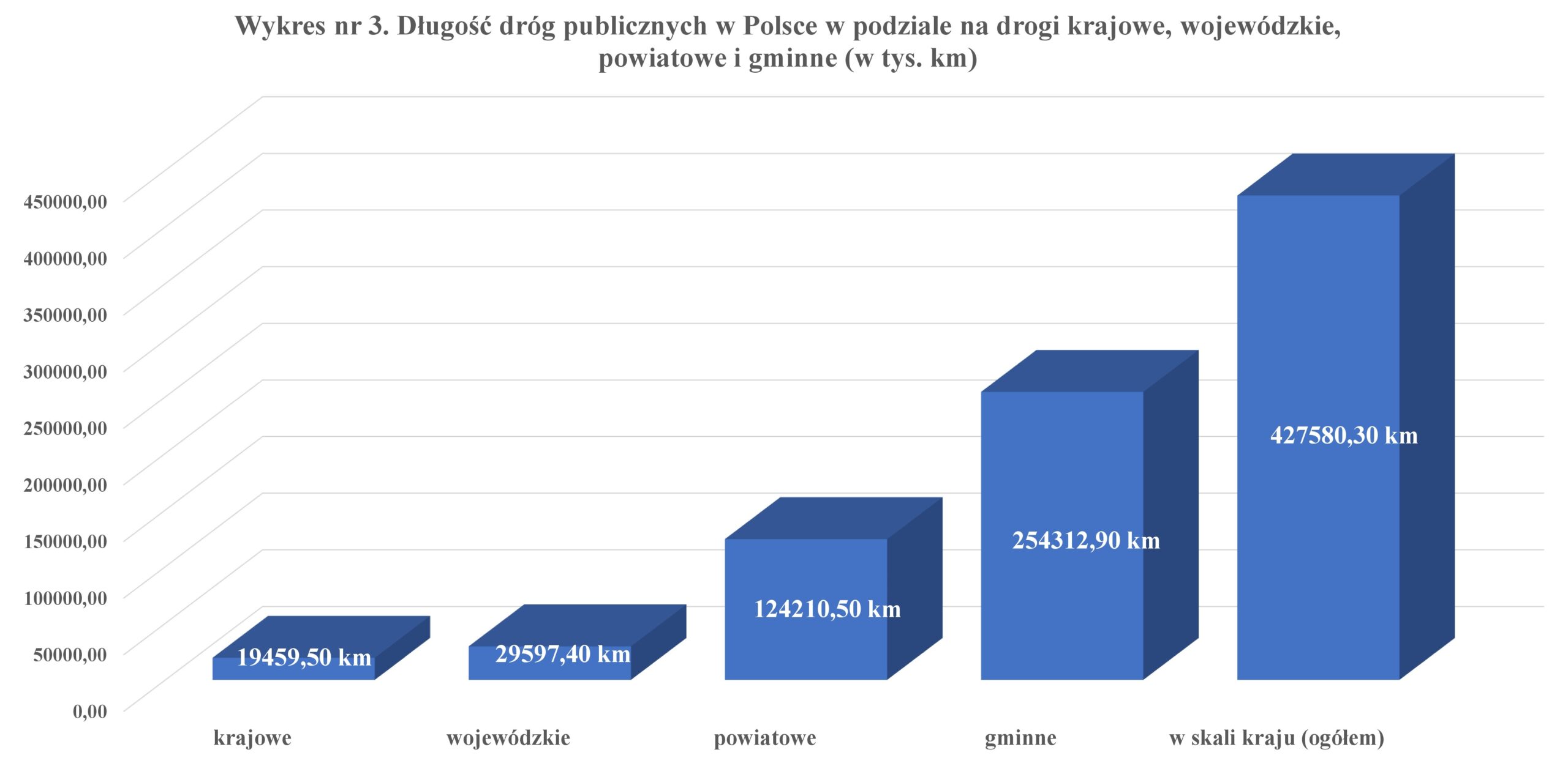 Wykres nr 3. Długość dróg publicznych w Polsce w podziale na drogi krajowe, wojewódzkie, powiatowe i gminne (w tys. km).