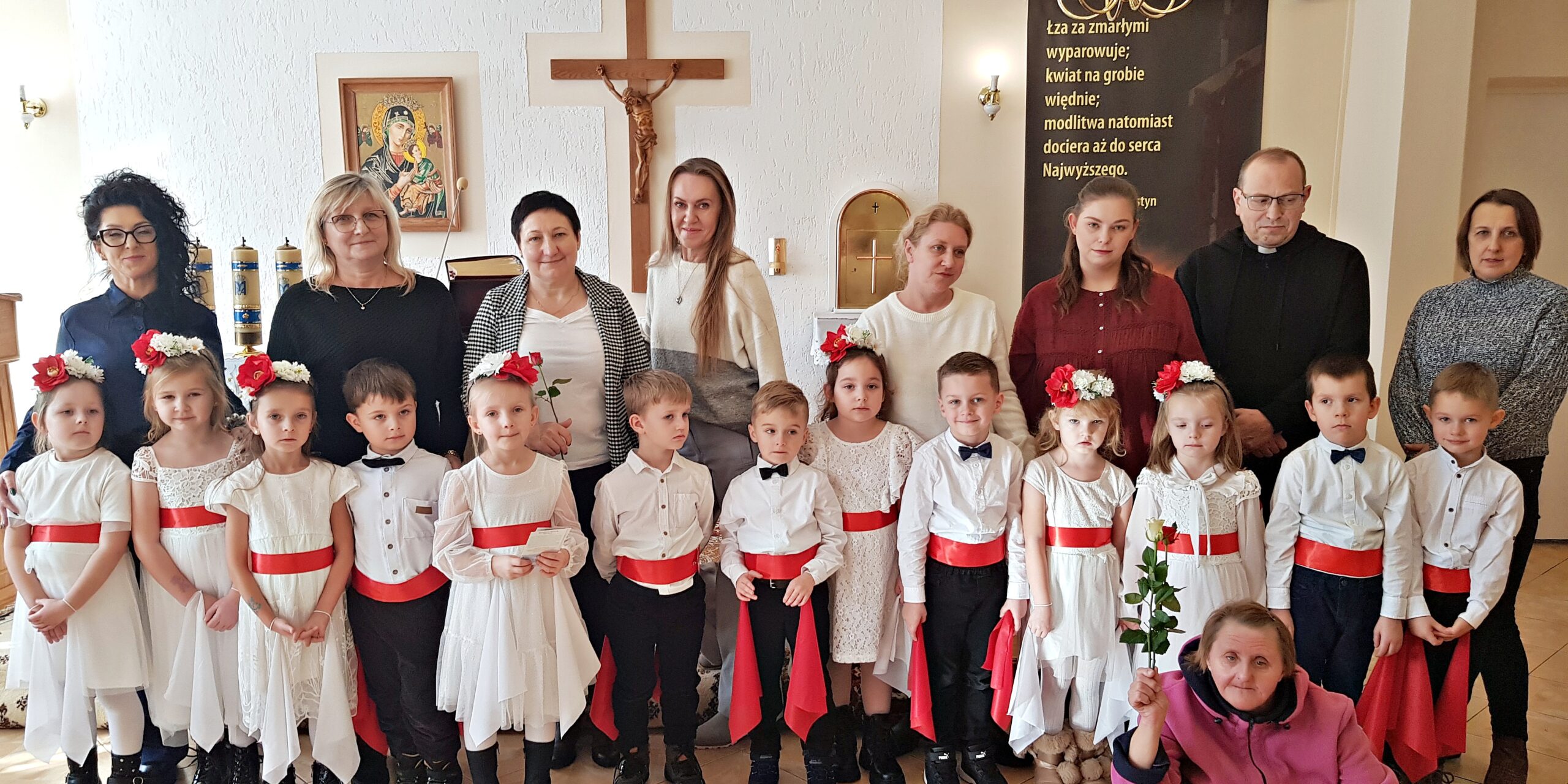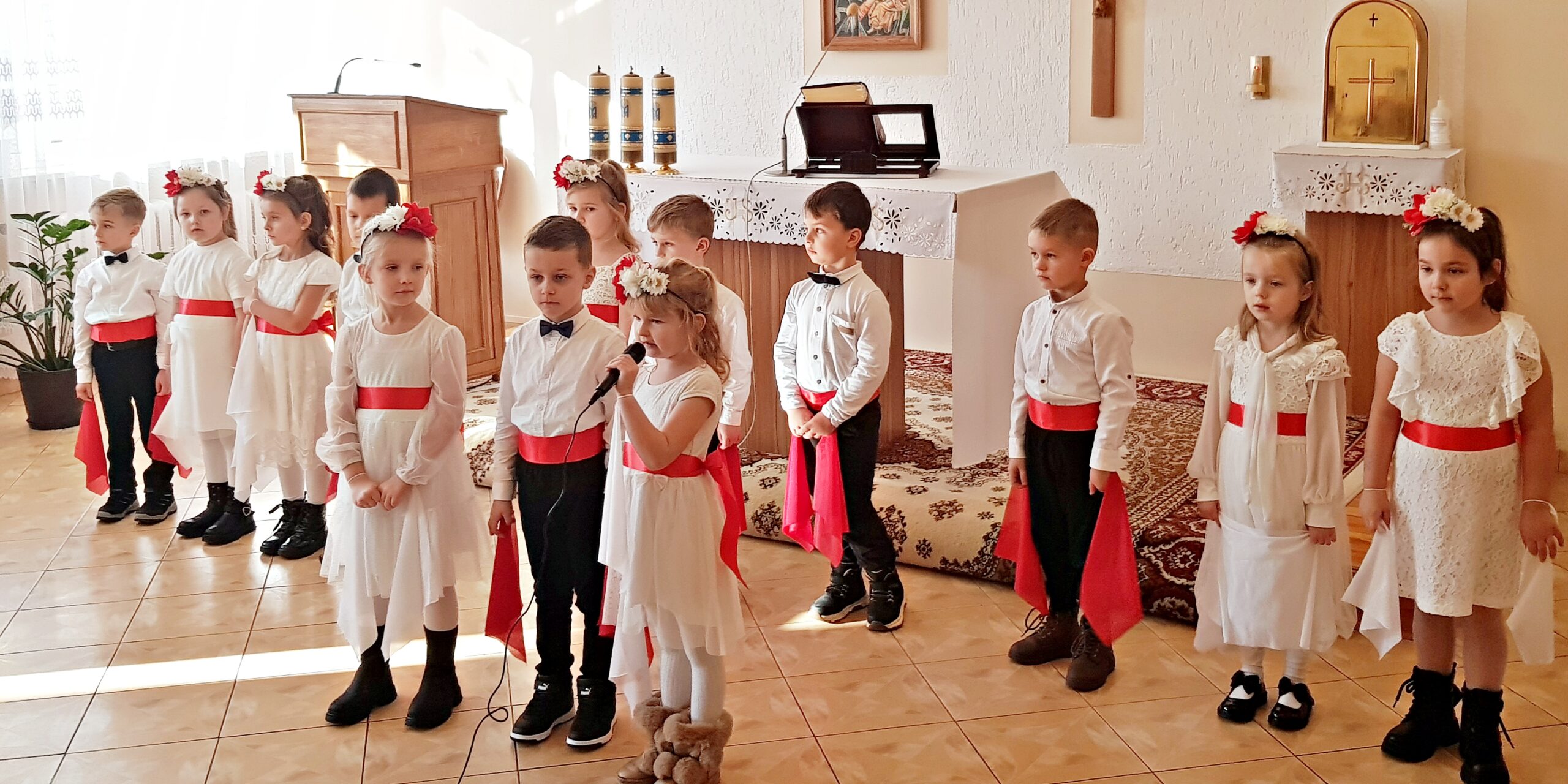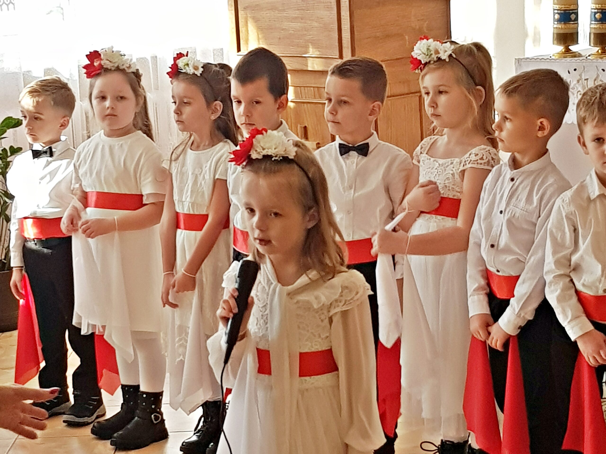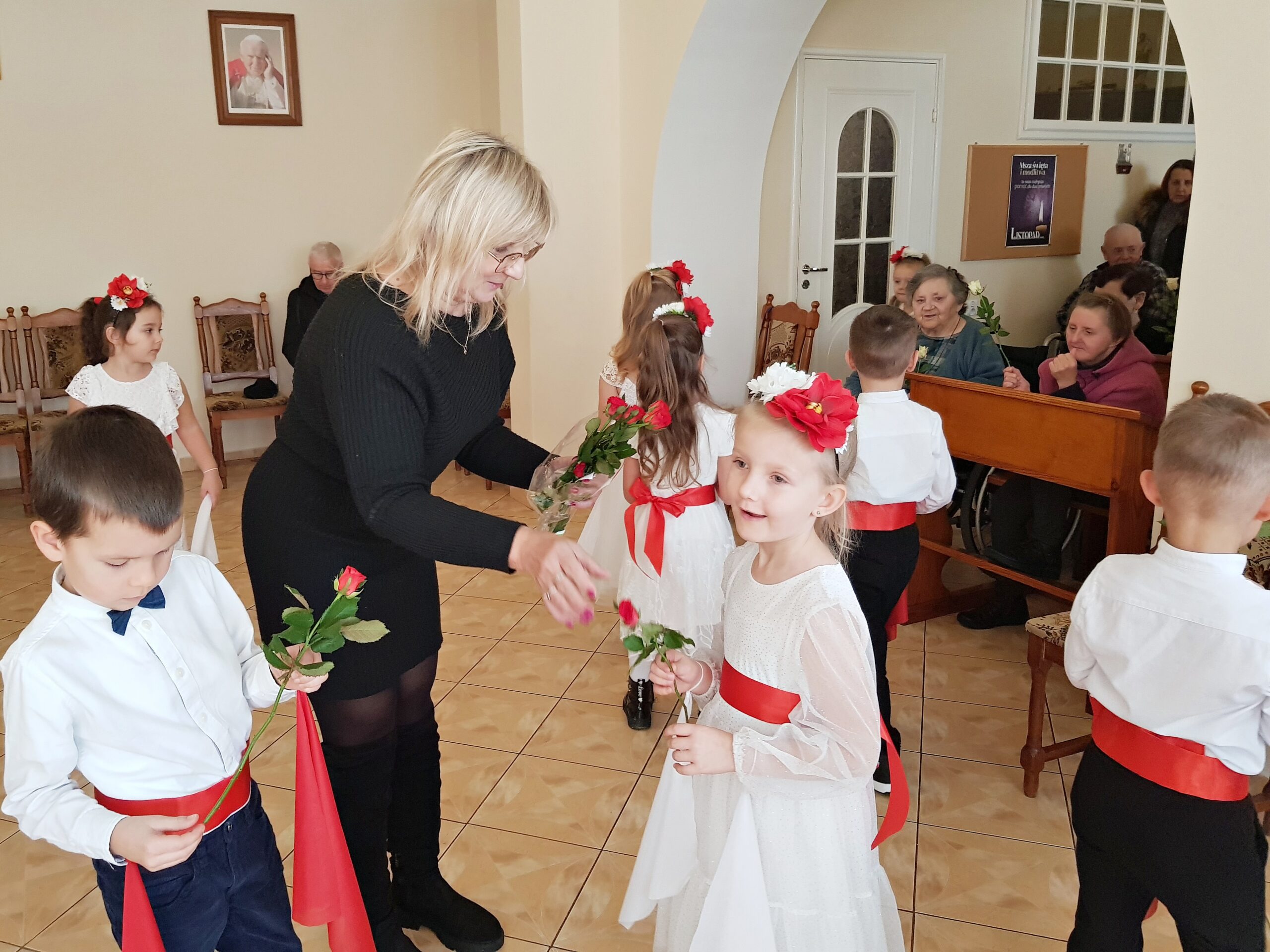 Dzieci była gromadka… „Brzdące” hymn Polski dumnie odśpiewały, poloneza odtańczyły, wiersze deklamowały, o bohaterach, walczących o Polskę – gdy inne kraje atakowały, opowiadały… I patriotyczne piosenki śpiewały, a na koniec mieszkańcom i pracownikom Domu Pomocy Społecznej białe i czerwone róże podarowały…