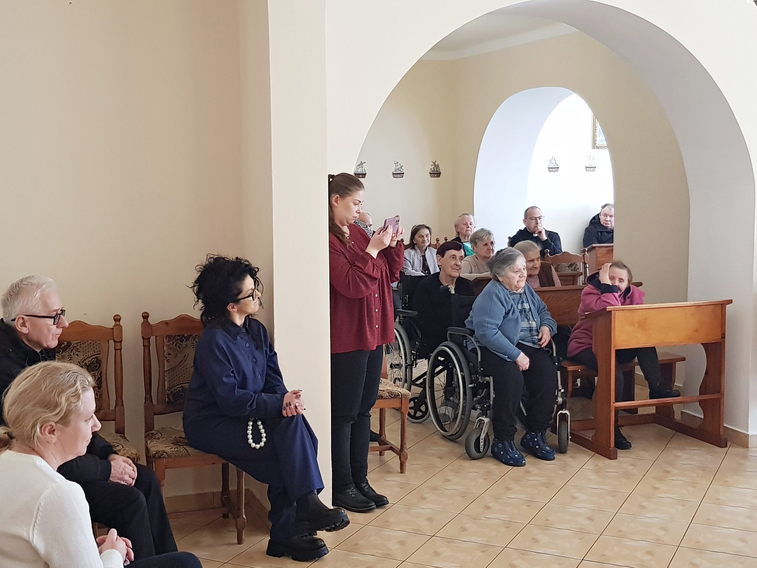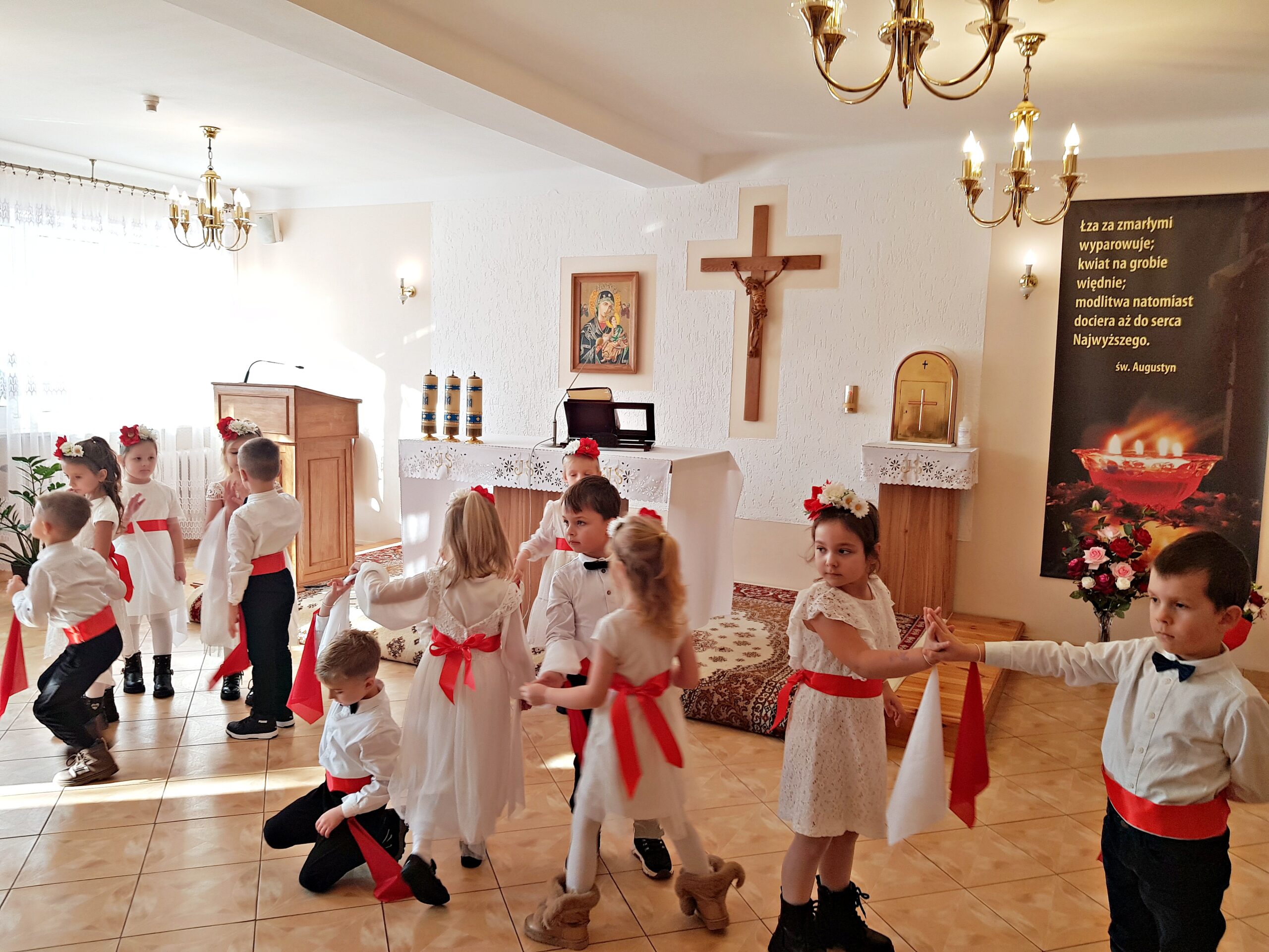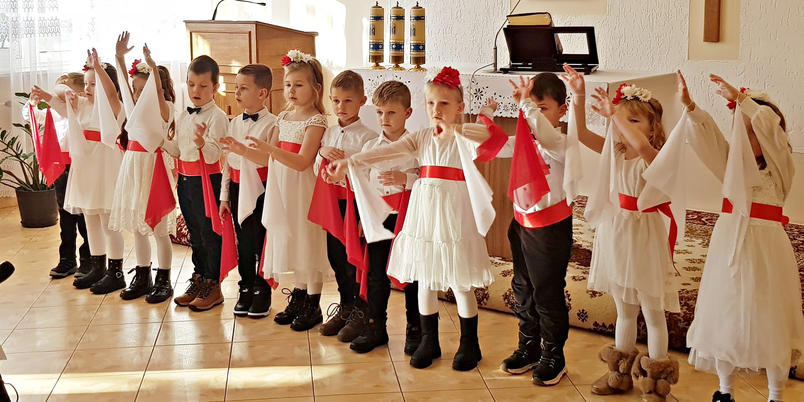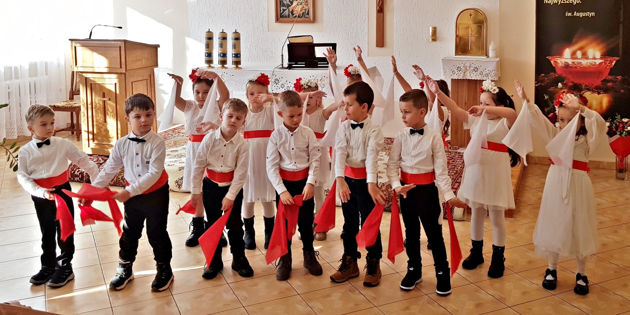 Dzieci była gromadka… „Brzdące” hymn Polski dumnie odśpiewały, poloneza odtańczyły, wiersze deklamowały, o bohaterach, walczących o Polskę – gdy inne kraje atakowały, opowiadały… I patriotyczne piosenki śpiewały, a na koniec mieszkańcom i pracownikom Domu Pomocy Społecznej białe i czerwone róże podarowały…