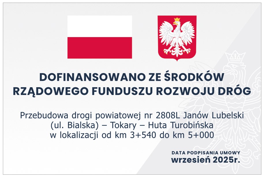Rządowy Fundusz Rozwoju Dróg Przebudowa drogi powiatowej nr 2808L Janów Lubelski (ul. Bialska) – Tokary – Huta Turobińska w lokalizacji od km 3+540 do km 5+000 Przebudowa drogi powiatowej nr 2816L Łążek Ordynacki – Momoty Dolne w m. Momoty Dolne od km 6+867 do km 8+141 Przebudowa drogi powiatowej nr 2808L Janów Lubelski (ul. Bialska) – Tokary – Huta Turobińska w lokalizacji od km 12+800 do km 15+313 i od km 15+435 do km 16+081 Przebudowa dróg powiatowych nr 2825L Dzwola – Kocudza Druga od km 0+009 do km 2+469 i nr 2824L Dzwola – Zdzisławice od km 0+000 do km 0+647 Remont drogi powiatowej nr 2820L Szklarnia – Flisy w lokalizacji od km 0+003 do km 4+472 Budowa drogi dla pieszych w ciągu drogi powiatowej nr 2822L Zofianka Górna – Zofianka Górna w m. Zofianka Górna Przebudowa drogi powiatowej nr 2828L Janów Lubelski ul. Okopowa w lokalizacji od km 0+010 do km 0+680 Przebudowa drogi powiatowej nr 2815L Modliborzyce – Gwizdów – gr. woj. w lokalizacji od km 0+410 do km 1+622 Przebudowa drogi powiatowej nr 2814L Potoczek – Bania w lokalizacji od km 3+010 do km 6+072 Przebudowa drogi powiatowej nr 2819L Janów Lubelski ul. Bohaterów Porytowego Wzgórza w lokalizacji od km 0+043 do km 2+053 – ETAP I od km 0+780 do km 2+053 Przebudowa drogi powiatowej nr 2815L Modliborzyce – Gwizdów – gr. woj. w lokalizacji od km 2+050 do km 7+505 Przebudowa drogi powiatowej nr 2819L Janów Lubelski ul. Bohaterów Porytowego Wzgórza w lokalizacji od km 0+043 do km 2+053 – ETAP II od km 0+043 do km 0+780