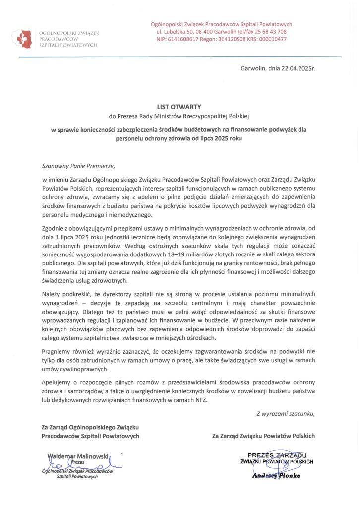 Służba zdrowia. List otwarty do Premiera RP w sprawie konieczności zabezpieczenia środków finansowych na podwyżki od lipca 2025