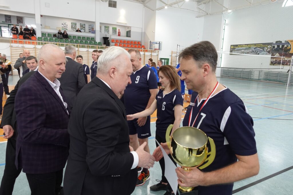 Zdj. 4. Uroczystość zakończenia VI turnieju siatkarskiego, w której wzięli udział zaproszeni goście (od lewej): Dyrektor ZSCKR w Potoczku Dariusz Wolan, wiceminister rolnictwa Jacek Czerniak, wójt gminy Potok Wielki Leszek Nosal, wizytator w MRiRW Marek Juszczyk, Prezes WFOŚiGW w Lublinie Stanisław Mazur, Dyrektor WFOŚiGW, Wicedyrektor ZSCKR w Potoczku Andrzej Olszyński.
