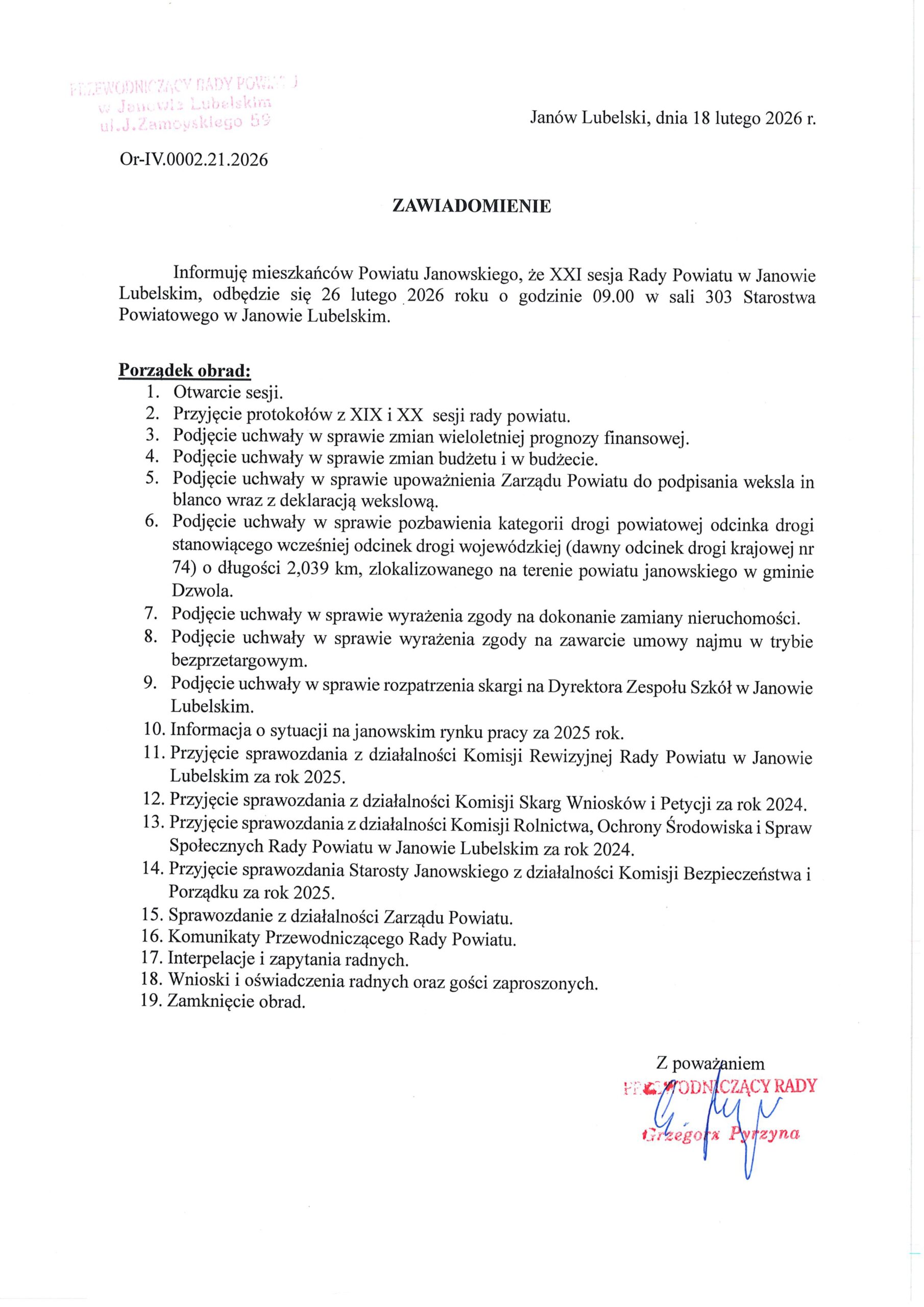 Zawiadomienie o zbliżającej się Sesji Rady Powiatu Janowskiego